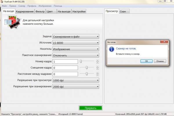 - Клацаю по ярлыку VueScan - после загрузки на окошке советов - "Ваш сканер не готов для сканирования, вы должны вставить плёнку перед сканирование" Закрываю окошко и загружаю холдер, происходит описанная выше процедура. нажимаю в программе зелёную кнопку ПРОСМОТР. После этого выскакиевае окошко как на скриншоте