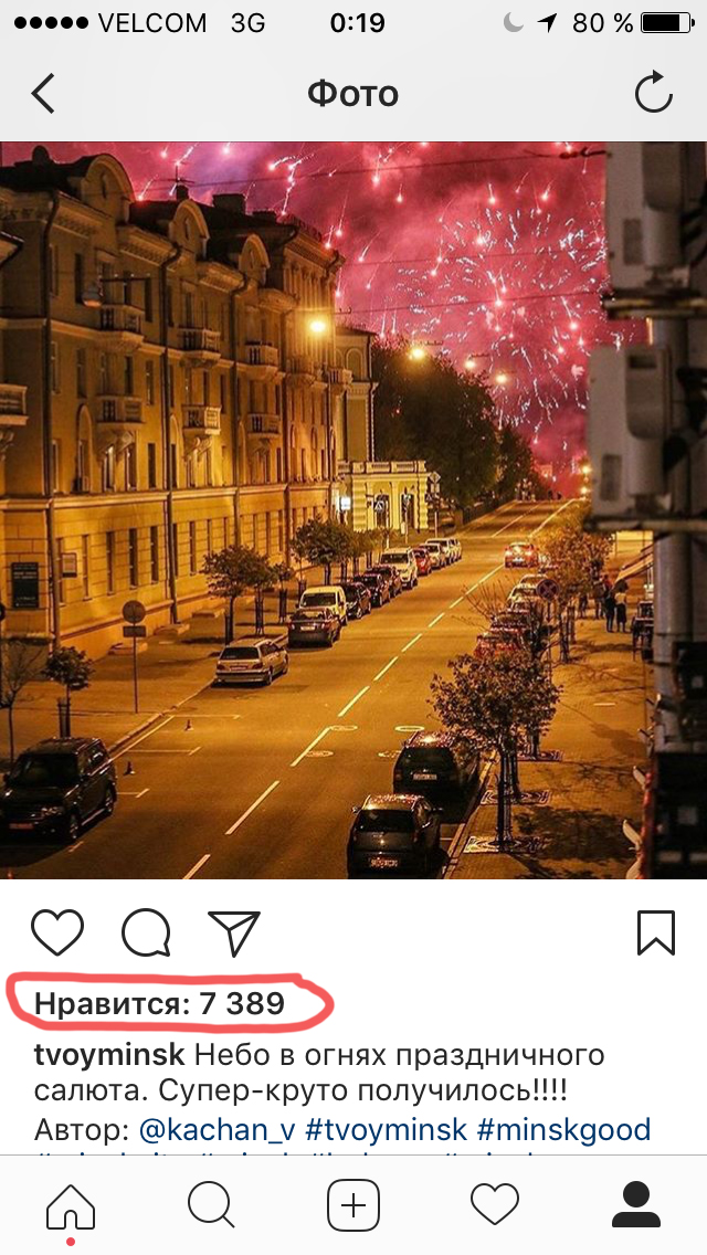 В Instagram мой снимок праздничного салюта в Минске на 9 мая отметило более семи тысяч человек.