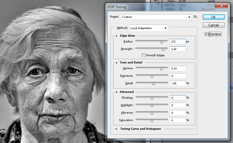 Во-первых, что касается "бабули". На мой взгляд, с точки зрения техники обработки, совершенно не важно, кто изображён на фотографии - Дж. Клуни или Васильева Д.К.