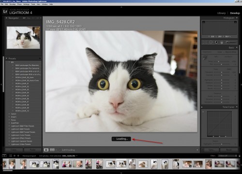 Когда же переходишь в режим Develop, то при переходе к редактированию новой фотографии происходит загрузка (Loading...)