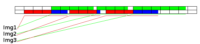 Чёрная сетка -- это кластеры. Зелёным цветом обозначены места реальные расположения файлов Img1, Img2, Img3. В каталоге находятся адреса кластеров, с которых начинается файл (указано наклонной линией) и длина этого файла (указано горизонтальной линией). И когда какая-то программа запрашивает у ОС чтение файла, то эта ОС выдаёт этой программе данные, начиная с кластера, который указан в каталоге и выдаёт столько байтов, сколько занимает данный файл.