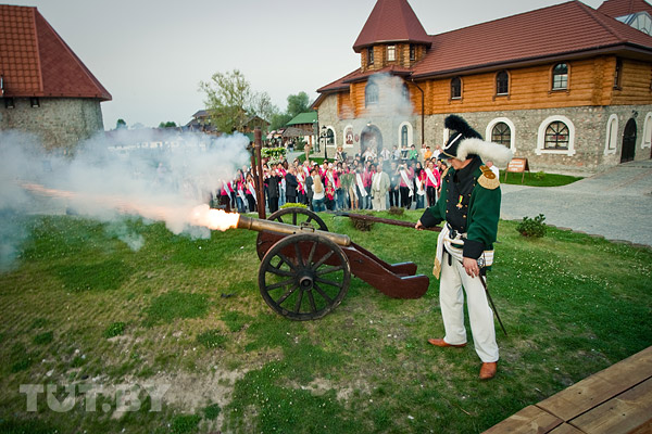 Выстрел пушки в Коробчицах во время посещения музея участницами конкурса красоты Мисс Интерконтиненталь.