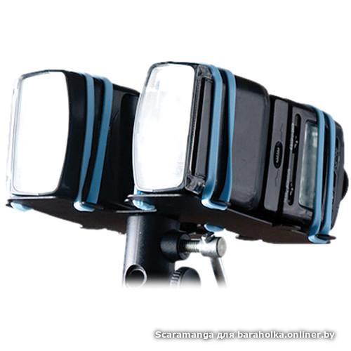 Простой и эффективный способ крепления двух накамерных вспышек на одном штативе/кронштейне. Хотите ли вы увеличить экспозицию или сократить время перезарядки (используя две вспышки на половинной мощности, а не одну на полную мощность), наличие большего количества света всегда будет хорошей идеей. Система включает в себя кронштейн и набор из 4 резинок