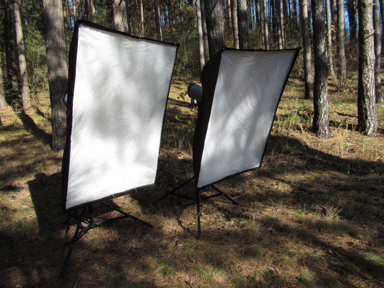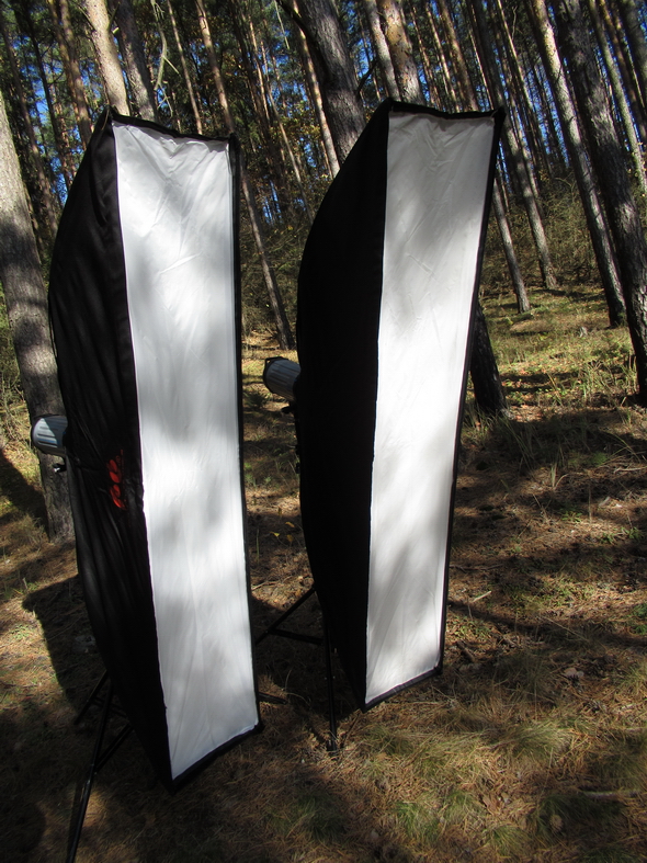 Основной свет Falcon Eyes DE 300B_2шт. Софтбоксы 75х75_2шт и 40х180_2-шт. Стойки LS-2600.
