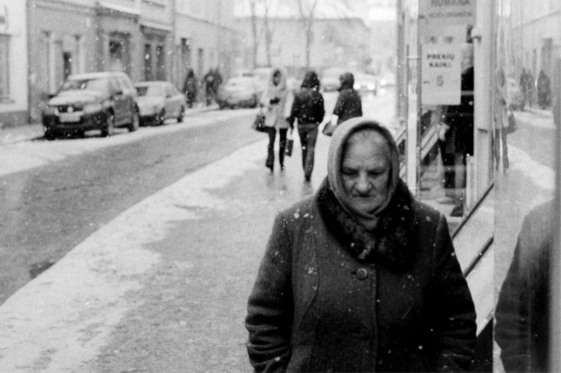 Второй, шел по улице, камера была не то что бы наготове, но в руках (до этого делал некоторые снимки, после не убирал в сумку, держа в руках прикрывая от снега), бабушку приметил еще с несколько большего расстояния, что и позволило успеть сделать снимок.
