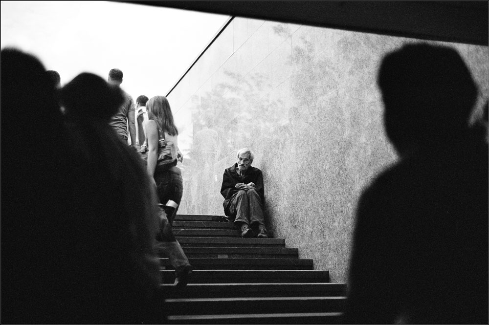 Нечто иное от чего я прусь в стрите - снимок человека (когда он либо главный объект в кадре, либо еще с кем то) уставившегося прямо на меня или на камеру. Мне нравятся такие фотографии: когда человек смотрит в вашу сторону но (как вам кажется) не замечает камеру. Такой кадр возможен, если вы мгновенно фотографируете выражение лица и взгляд до того как он поймет что собственно вы сделали. Это вопрос долей секунды!