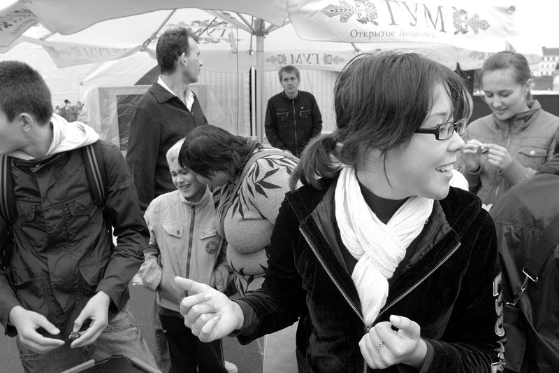 Вот смотрите. Возле кинотеатра девушка, стоя в полуметре за мной, говорила с подружкой по телефону – искали друг друга. Удалось поймать момент, когда ее подружка нашлась. Глаза девушки смотрят не в объектив, а на подружку, которая стоит за мной и улыбается она ей. Но в объектив все это попало. Я смотрел в видоискатель и снимал, когда девушка нарисовалась из толпы, заметила подружку, улыбнулась ей, помахала ей рукой и пошла к ней. При этих действиях направление ее глаз не менялась, ни один мускул не выдал, что она переводила взгляд с подружки на фотоаппарат. Поэтому я уверен, что улыбка – ее искренняя радость при виде подружки.