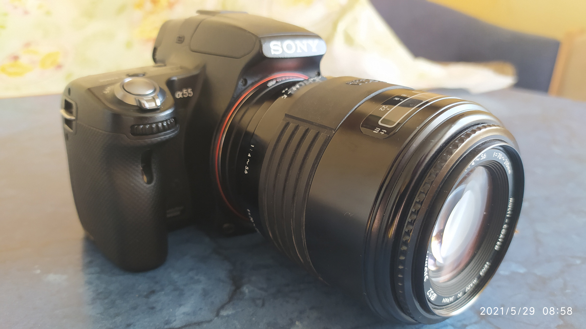 Продаю Sony A-55 вместе с зумом Sigma 70-210 мм. Б/у. Состояние внешне 6/10. Все рабочее, линза без царапин, автофокус рабочий. Аккумуляторы 3 шт., но надо менять, высаженные. Отдам также переходник на м42, пульт ДУ. Пробег 37 451. Цена 220 BYN. тел.+37529 3195801