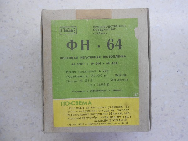 чёрно-белая листовая негативная фотоплёнка, Свема, обработать до XI-1997 г., не проверялась, шансы пригодности к использованию достаточно велики, рекомендованная чувствительность для экспонирования - ИСО 12 или ИСО 6