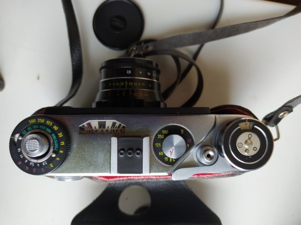 Комплект на фото. В рабочем состоянии. Со слов хозяина, ни одной пленки не отснял. Выдержки отрабатывает. Экспонометр работает. Резкость по жёлтому пятну не наводится, возможно заводской брак. Если на него снимать - нужна юстировка.